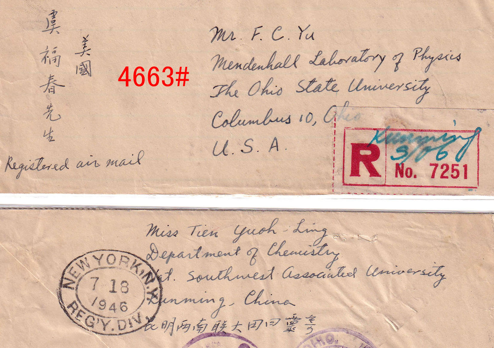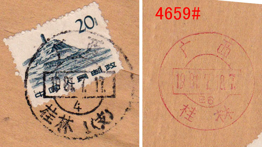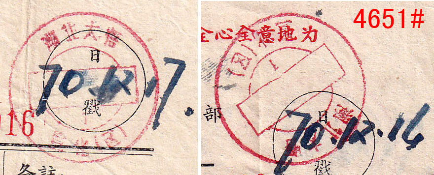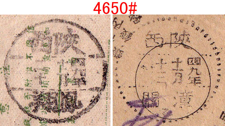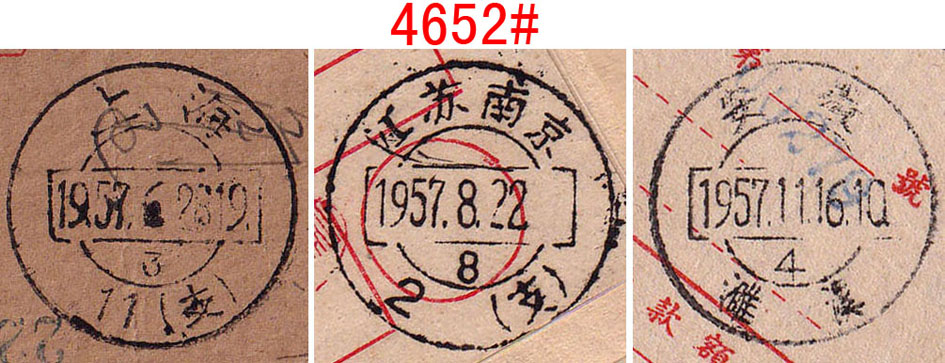 4641#、库伦1955.7.31邮电收据,盖沿用日式东北特殊戳,库伦在内蒙古,邮品颇为少见。无底价 4642#、难得的一组7件北京不同支局三枚戳挂号单,为1952-1954年间寄黄县徐格庄,单式各异,戳式不同,配对颇为难得。无底价 4643#、特殊的合二为一包裹单:云南陇川弄巴1987.6.1-四川中江6.13包裹单,邮资20.98元,因包裹单面积有限,邮票又不能叠贴,所以另外附贴一张包裹单作贴票之用,计贴普21.50分41枚、8分1枚、普22.20分两枚,其中50分12方连、28方连各一件。贴用如此之多颇为难得,这种加贴包裹单贴票方式与上一件对比颇为有趣,说明每个邮局的处理方式都有不同,但以这种加贴包裹单为少见。无底价 4644#、有趣的先收后贴包单,浙江新昌大明市代办所1981.10.31-浙江新昌10.31-江苏镇江农机学院11.8包裹单,邮资40分,贴普18.20分两枚。本件颇为特殊,先由公社代办所收寄,因缺票,只能先收现金,然后交上一级的县局贴票寄出,所以收寄戳和销票戳为两个局名。落地戳则是少见的“农机学院”学校戳,颇为难得。无底价 4645#、甘肃兰州(包)1954.1.13-天水师范包裹单,盖包裹专用“包”字日戳,另盖“兰州市人民政府税务局准予托运第肆号”紫色放行章,由甘肃省教育厅寄高校的相关表册,背面另印有快递小包、征询业务、集邮等宣传广告,其中征询业务就是代人打听人事,很快就停办。“包”字专用戳用于包裹上较少见,也是邮戳中的特殊品种,邮史、邮戳、教育史并重。无底价 4646#、北京阜成门2000.6.27“日戳打印、交接簿”,上盖有该局各种不同编号和业务戳样,包括特快专递专用戳,并有“京B196、194、198”不同编号、机型无面值邮资机戳签条样张。这是邮局规定每天营业时留下的戳样,因都是在邮局存档,实物难以流出。无底价 4647#、黑龙江宝清县钢字302信箱1975.12.7-北京12.12挂号,贴普14、普17各一枚,邮资28分,超重挂号邮件。由文革时期黑龙江生产建设兵团“钢”字信箱保密邮局寄出。无底价 4648#、广西南宁1953.11.10-广东顺德乐从鹭州代办所包裹单,贴普1.3千元两枚 ,邮资6千元,邮票按规定对剖。落地戳沿用民国右读戳,日期栏加嵌“代”字,较为少见,广西50年代包裹业务少见。底价50元 4649#、著名的广东省立法商学院(后并入中山大学)邮件:广东番禺石榴岗代办所1951.5.23-广州5.24-台山平信,贴普4.800元,带有校子家书,使用该校中式全中文公函封,信内容有关毕业就业等,并问及家乡土改情况,评了什么阶级?时代信息浓厚,该生为台山籍侨生,以侨汇为学费。法商学院位于广州市河南石榴岗,为便于学校师生通邮,设有邮政代办所,使用三级地名邮戳,建国后继续沿用,但略为改良,在日期栏加嵌“代”字。落地戳则是特殊和少见的没有波纹小型机盖日戳。 广东省立法商学院前身为广东省立勷勤大学商学院,与工学院、教育学院并称该校三大院系。1938年改组为独立设置的广东省立商学院,该学院于广州沦陷前迁至广西容县,后辗转广东信宜、湛江遂溪等地办学。1946年迁回广州并更名为广东省立法商学院。1952年院系调整中,学院相关科系并入新组建的中山大学等院校。本件正是合并入中山大学前夕寄出,难得的高校邮史、教育史。底价500元 4650#、陕西潼关、凤翔1949年11月/12月间使用挂号函件执据2件,所用的“四九年”年份颇为特殊。因此时新中国已成立,民国“卅八”字钉已不适用,1949年字钉又没有获发,因此地方自行刻制特殊的“四九年”字钉使用,地方特色和新旧政权更替见证。无底价 4651#、颇为特殊和少见的文革时期手填戳话费单一组两件,湖北大悟1970.12.14/12.17“最高指示”毛语录话费收据,盖无日期红戳,再手填日期。这种文革时期手填戳颇为特殊和少见,文革邮史特殊邮品。无底价 4652#、57式邮戳首年使用收据、购买邮票单一组三件,分别为上海11支局1957.6.28、江苏南京1957.8.22、安徽濉溪1957.11.16,均为57式邮戳的早期使用例。无底价 4653#、东北特殊日式戳“电报回执”:海城邮电局A1951年5月21日发给棉花公司的电报回执,报费合计15570元。此时正值东北币与人民币更替期间,改8改9也是这时期发行。所用戳式为特殊的下月牙带英文“A”字日式沿用戳,颇为难得。无底价 4654#、甚为少见的50年代末“军政电报”封,使用“上海市邮电管理局杨浦邮电支局”绿色电报封套,盖有长方形“S军政电报”紫戳,属邮电支局自印版式,此种电报限军政专用,实物很少见。底价120元 4655#、上海11支局1955.2.11-上海12支局2.11-上海12支局2.12印刷品,盖沿用民国时期右读式“国内邮资已付”戳,因该戳从民国使用到建国,已经破损不堪。本件由上海市书业同业公会寄新音乐出版社,毛笔字书法美丽。见证早年百花齐放、百家争鸣的可喜现象。无底价 4656#、上海1955.10.21-上海1支局10.22印刷品,盖沿用民国时期特殊的“本地邮资已付”八角戳,此戳为地方特有。本件由上海市内衣织造工业同业公会寄出,寄给著名的黄林华内衣厂,带有会费通知单,信封和该单都是废纸改制,见证新中国初期百废待兴,废物利用的环保理念。无底价 4657#、少见甘肃地区人民邮政加盖票封:甘肃山丹1950.2.22-上海3.5平信,贴孙像金圆票加盖人民邮政(甘)50元15枚,失票一枚。贴用此甘肃地方加盖区票大方连很难得。底价600元 4658#、比例失调特殊邮戳包裹单:四川荣县成佳1975.2.10-四川新龙2.27/4.1包裹单,贴普15、普12,邮资1.1元。本件经成都中转时盖