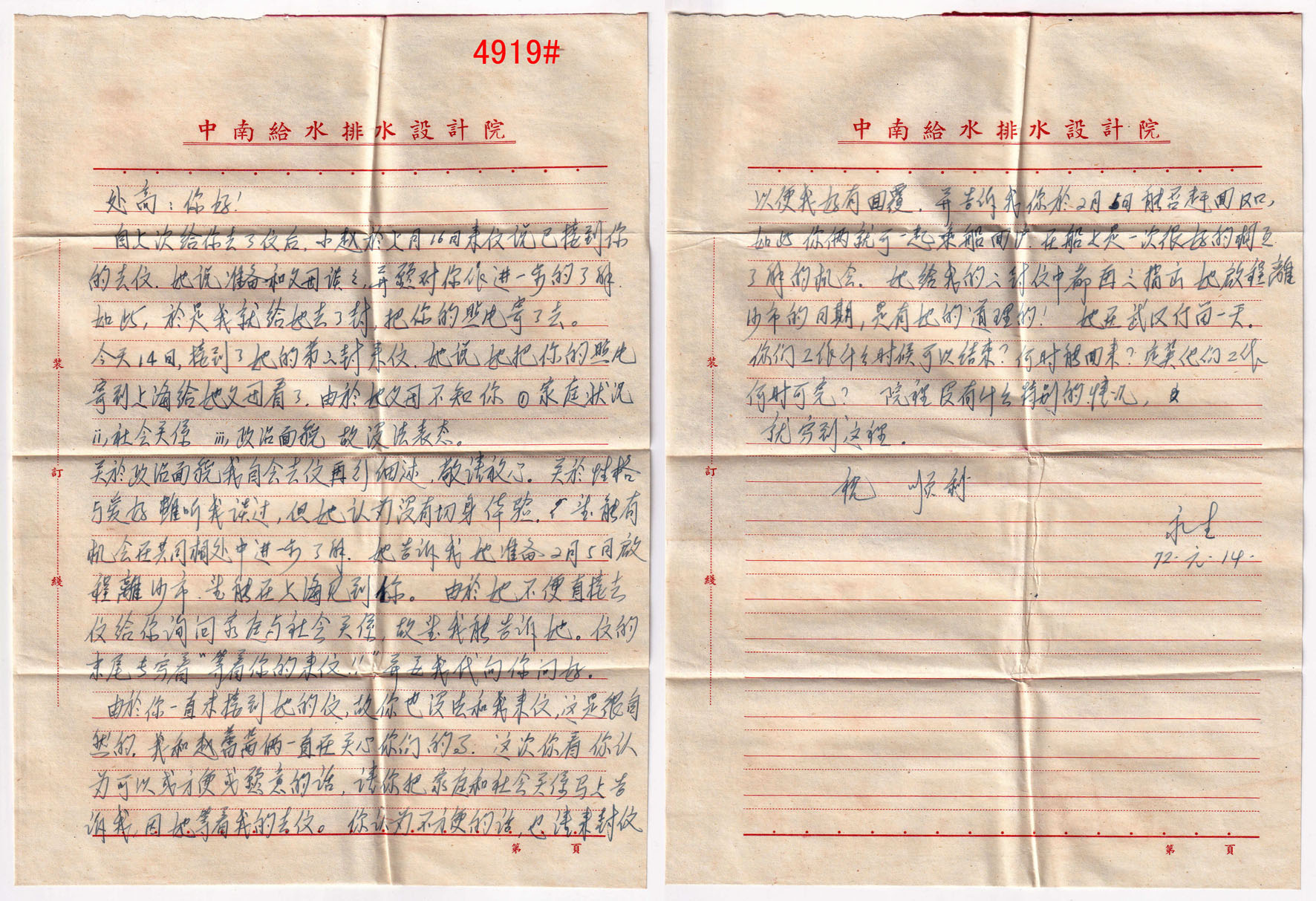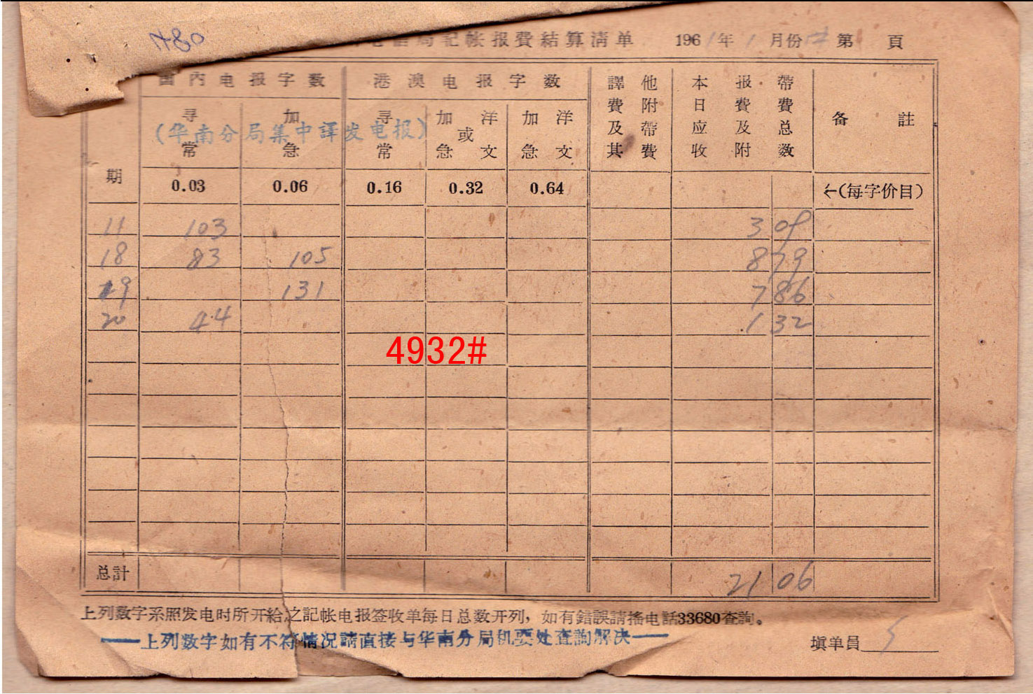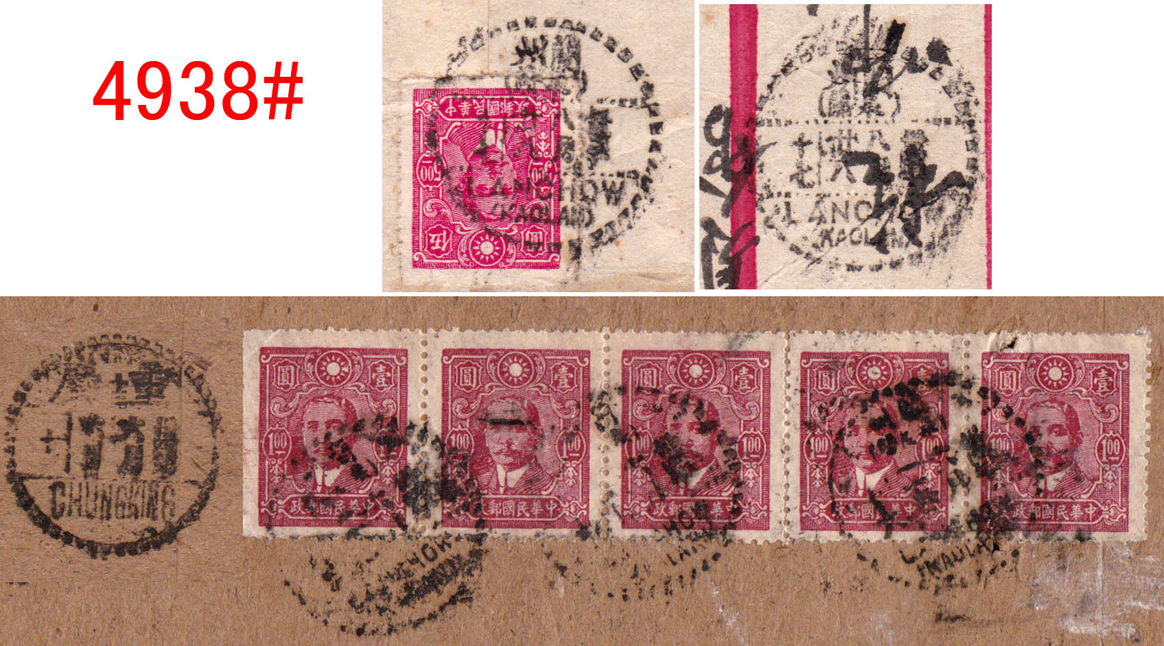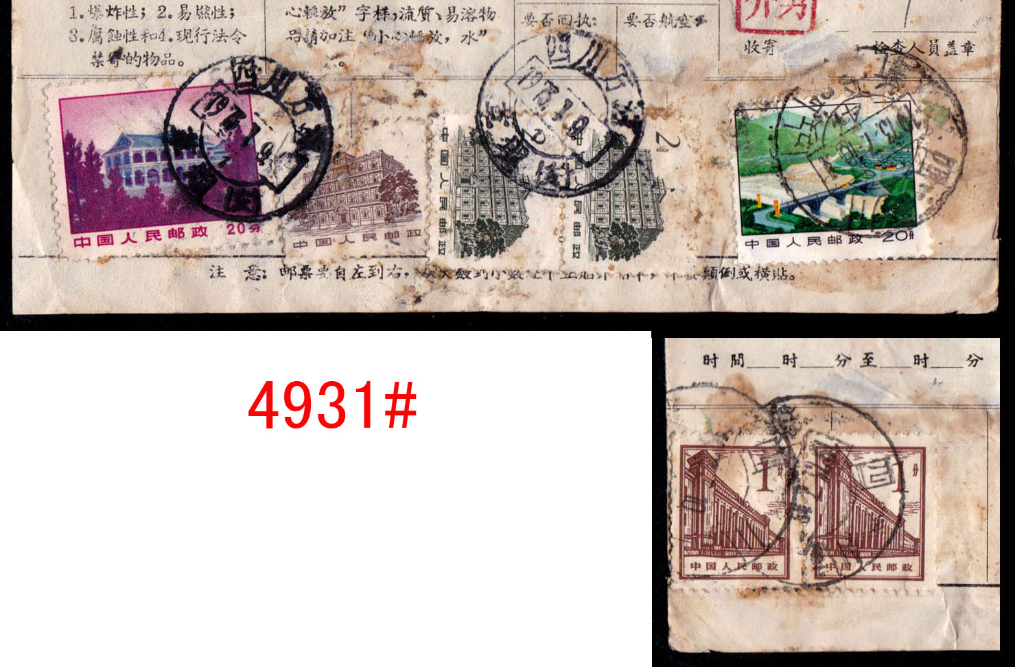 “推邮啪”微拍群创建于2015年,由麦国培负责把关主持,至今已拍卖超过2.9万项邮品,无一例伪品和争议。因群经常满人,需要参拍请联系群主(微信号:m52740)排队入群或委托出价,谢谢理解。所有拍品均为高清大图,微信看图时请点下面的→查看原图→即可。 4911#、两岸通邮封一组7件,其中6件带信,1988-1997年间从台湾台南寄回天津,包括三种不同寄件方式,最初是通过“香港内详”方式寄回,然后是把信带回大陆贴票寄回,最后是两岸直接通邮,贴台湾邮票寄回。反映了早期两岸交流方式的改变。底价200元 4912#、内蒙古镶黄旗1987.8.1-天津YP3风景邮资片航空寄,加贴内蒙民居1分两枚,邮资共6分。这种邮资片航空寄很少见,另盖纪念戳。底价50元 4913#、非常少见的文革时期寄国际欠资封:上海1972.8.7-上海8.9-上海8.12-美国航空欠资,贴文18.43分。此时国际航空为52分,本件欠资9分,正面盖有“T”欠资数字戳。使用和平饭店中文封,相信是入住该饭店的外籍人士所寄,因不懂中文,按照其书写习惯把信封倒转使用,地址在左上角。邮件不知何故在上海转寄处理两次,盖不同邮局不同日期戳,然后再寄出。很可能在这个过程中寻找寄件人补纳邮资,最后寻找不着只能寄出。此封颇为特殊和有趣,文革时期国际欠资邮件很少见,相信这也是该封特殊处理的原因之一。值得研究的文革邮史、国际欠资邮件。底价500元 4914#、广东红旗文化邮政所1968.1.3-上海1.26免费军邮。该封由通什海军寄出,起戳是文革时期改地名的“红旗文化”特殊戳,颇为难得,使用语录封,时代信息浓厚。底价50元 4915#、天津塘沽海员俱乐部1968.8.19-荷兰航平,贴文4.52分,该戳封少见。底价1000元 4916#、河北唐山市革命造反一中(驻军)-上海1967.12.15免费军事邮件,盖三角军邮免费戳,寄上海革委会,使用毛语录封。背面另书最高指示,时代特色浓厚,可见当年的造反一中实际是驻军,所以可以使用军邮免资戳寄件,颇为少见。底价50元 4917#、1961-1968年齐白石美术封实寄一组三件,贴普8、普12、普13等票,其中一件明显是文革前所印,在文革时期加盖“最高指示”继续发售,颇有特色。底价50元 4918#、青岛沧口1966.12.31-四川西昌平信,贴普13.8分,销票戳为特殊的无省名日戳,带有内信,使用毛语录封。底价100元 4919#、文革时期两次使用封:1,江西崇义思顺1971.7.17-湖北武汉7.23平信,贴普13.8分;2,湖北武汉1972.1.14-本市保密信箱,贴文普纪念碑,带有内信,文革时期这种两次使用环保封少见。底价50元 4920#、河南南阳宛4(所)1974.1.13-湖北武汉1.16平信,贴普14天安门,带有革委会内信,由保密信箱寄出,特殊的文革邮史。底价100元 4921#、北京永乐店1965.9.3-北京17支9.3不贴邮票封,带有数纸内信,背面有中南海专用邮局17支局落戳以及国务院收文章,此北京地名封少见。底价100元 4922#、北京大学邮件一组两件:1,北京成府1954.5.16-江苏镇江(支1)投5.18平信,贴普7.800元,由北京大学寄出;2,北京(9)处8 1955.1.19-北京成府1.21平信,贴普7.400元,带有北京大学信笺书信三纸。此组均为北京大学成府邮局收和寄,配对不易。底价300元 4923#、安徽明光1952.1.3-上海1.4明信片,使用仿版孙像8分邮资片新中国加盖人民邮政作废使用,再预贴普4.200元两枚作邮资片发售,实际为格式化邮政用品。书信内容颇有时代特色。底价150元 4924#、新疆吐鲁番1954.9.3-太原9.18普4阁楼邮简,销票戳是沿用民国时期的右读戳。邮间内有通信内容,可值得一阅。底价500元 4925#、上海1951.6.2-上海6.2平信欠资封,贴改5.100元两枚,此时本埠平信邮资为400元,本件欠资200元。正面盖“T欠资”副戳,较少见。底价400元 4926#、很少见的上海特殊“国内邮资已付”小圆机戳封:上海1951.4.17-上海4.18本埠裸寄领式单,正面有收件人施再兴地址姓名,是领取同丰印染股份有限公司1949年-1950年间股息的通知,贴有华东旗球图印花税票两枚。本件盖特殊的“国内邮资已付”机盖小圆戳,此戳实寄品很少见。底价300元 4927#、北京云辉玉宇牌坊明信片,由德胜洋行于清末民初发行。底价100元 4928#、土耳其1944.6.25-上海9支局8.11-上海23支局8.12-上海13支局8.15挂号,邮件到达上海后多次投递,少见的抗战时期进口封。底价100元 4929#、天津1900.4.2-上海4.7平信,贴蟠龙4分,属超重邮资。落地戳为上海工部书信馆“A”字轨全英文戳,销票戳是天津中英文小圆戳。底价300元 4930#、镇江庚戌年(1910年)七月初二-江苏南京七月初四-安徽伍保七月十四平信,贴蟠龙2分,不多见的干支戳封,此时邮资3分,此封可能失票1分。底价1000元 4931#、特殊又难得的文革时期转寄两次贴票纳费包裹邮件:四川万源草坝1973.1.9-四川甘孜白玉县-四川新龙7.10包裹单,邮资0.27元,贴文普20分等票四枚。本件原寄白玉县某部队,因换防等原因,邮件转寄到四川新龙,另需收转寄费0.22元。邮件到达后贴普13、普14共三枚,邮资22元,用四川新龙双文字大戳盖销。这种文革时期转寄,而且两次贴票纳费的情况非常少见,第一次所寄时贴的文普20分也较少见,本件难得,著名集邮家刘道宜老师旧藏。底价100元 4932#、1961年广州中国银行发给地质队的收据,贴有“广州电信局记账报费结算清单”两纸,有裂,编号(营-6017A),实际就是邮政的“邮资总付”计费单,详列电报价格,如国内寻常电报为每字3分、加急为每字6分。港澳寻常电报为每字0.16元,加急或洋文每字0.32元,加急洋文0.64元,即全部翻一倍计算。此种清单非