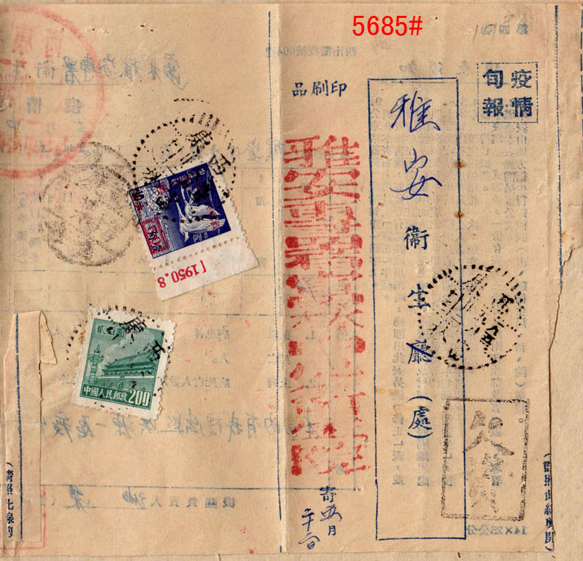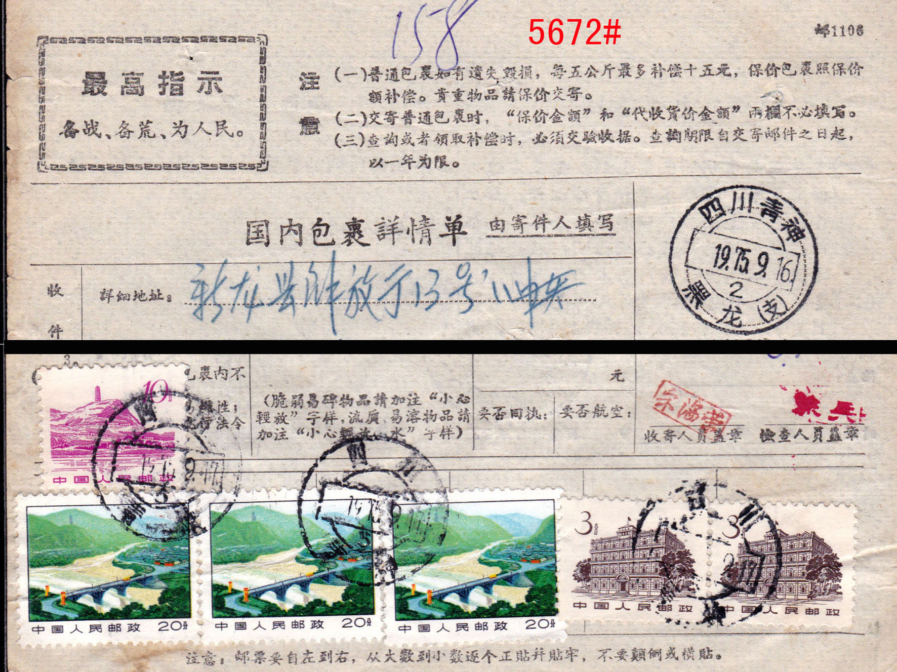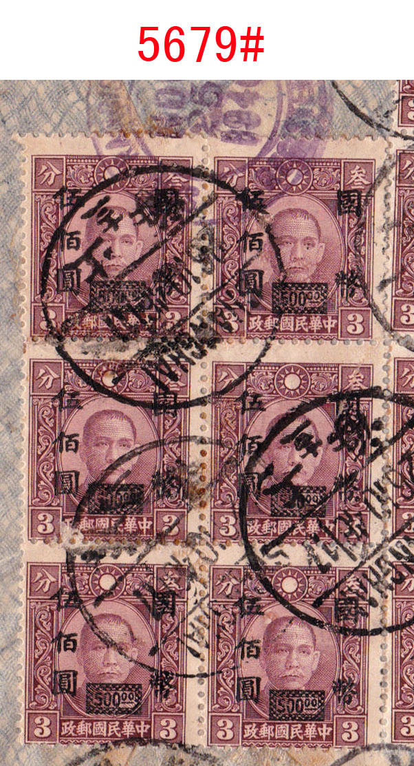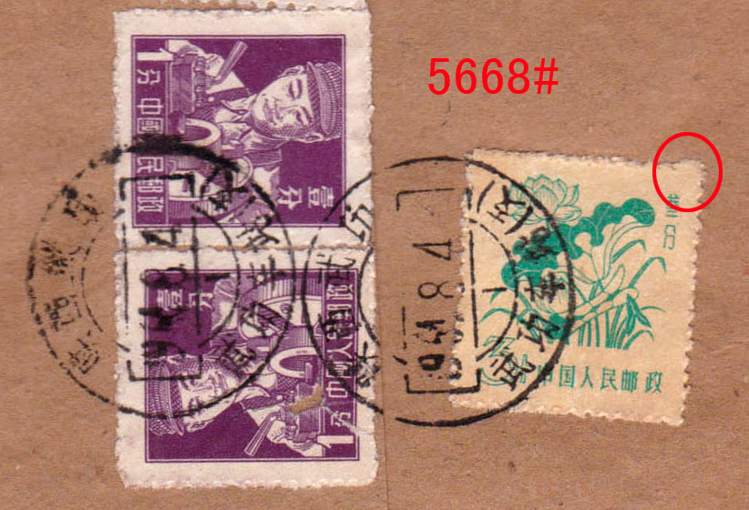 “推邮啪”微拍群创建于2015年,由麦国培负责把关主持,至今已拍卖超过2.9万项邮品,无一例伪品和争议。因群经常满人,需要参拍请联系群主(微信号:m52740)排队入群或委托出价,谢谢理解。所有拍品均为高清大图,微信看图时请点下面的→查看原图→即可。 5661#、著名的香港2.3元错简,文字“寄件人姓名”错印为“寄件姓人名”,香港邮政甚少出错,很是有趣的错体邮品。无底价 5662#、安徽合肥1994年12月24日“农村邮路排单”,盖有各车站、小学校等邮站、代办所收件章,见证农村邮路及邮政设置情况。排单制度沿于清代驿站,是地方邮史、邮路素材。无底价 5663#、1999年8-10月间湖北襄阳双沟特殊邮送电报回单、电报回单一组3件,版式均不相同,分红色、黑色两种,黑色又分有黑杠、无黑杠两种。背贴编年票、长城普票等,邮资有2.5元、2.6元不同。这种属特殊的邮政业务,规定定期销毁,实物流出较少见。无底价 5664#、长城1元套色大移位包裹单:四川岳池2001.9.8-安徽萧县9.15/16包裹单,邮资31.80元,贴用长城1元31枚、80分1枚,所贴的1元票全部是套色向上移位,可见黑色已经上移到红色底框,下边出现红色虚影,很明显的套色大移位。长城票变体不多见,贴用如此多枚难得。无底价 5665#、57式戳早期使用例:上海1957.6.24-上海6.25本埠平信,贴普8.4分。带有情书一封,书法美丽,正反写满内容,反映了新时代年青人恋爱观。销票戳为57式戳的首年早期使用,上海5月底开始推出57式戳,本件是次月使用。无底价 5666#、江苏南京1支局1973.2.14-安徽歙县平信,贴文普天安门8分,使用长江大桥美术封。销票戳是南京1支局特有的大“8”字子母戳,即在日戳外捆绑邮递员工号,通常都是小字,并不明显,可与下件作明显对比。这种捆绑特大数字的颇为特殊和少见,文革特色邮史和邮戳。无底价 5667#、文普1.5分单贴子母戳封:上海19支局1974.11.11-上海11.11本埠平信,贴文普1.5分邮票。盖“6”字小型子母戳,这枚特殊面值邮票的单贴符资使用例较少见。无底价 5668#、普10.3分局部漏齿变体封:陕西武功武功车站(支)1964.8.4-陕西汉明8.9挂号印刷品,贴普8.1分、普10.3分、普11.10分等有趣面值组合票四枚,邮资15分(印刷品3分+挂号12分)。其中所贴的3分荷花票右上角明显局部漏齿变体,这是邮票在打孔时针孔缺失偶然产生的漏齿,在实寄封上使用颇为少见。销票戳更是特殊的重复地名武功车站戳,车站邮件少见,由水利学校寄出并使用公函封。本件邮戳、邮票、邮政业务皆特殊,颇为难得。底价280元 5669#、江西路口1948.7.1-江西莲花7.4-东北锦西“挂号函件清单”,寄挂号信两件,盖大型江西莲花31cm大戳,正常戳只有27cm,本件足足大了4cm。特殊的邮戳和少见的寄东北挂号邮件单式。无底价 5670#、文革时期邮件清单一组两件:(1)江西婺源1973年6月22日“封发邮件清单”,使用最高指示单式;(2)徽州20支1970年6月14日“特种挂号函件内件清单”,使用毛语录单式。该戳非常特殊,是没有省名的保密特戳。无底价 5671#、江西景德镇1963.10.11-婺源包裹单,此时包裹业务不贴票也不盖邮资已付戳。景德镇使用特殊的五格皆有文字包裹专用戳,上月牙嵌“营”(营业),下月牙嵌“包1”(包裹组1号柜),是违规和特殊的包裹特戳,颇为少见。无底价 5672#、特殊的文革时期先收后贴票包裹单:四川青神黑龙1975.9.16-四川青神9.17-四川新龙9.25包裹单,使用语录邮制单式,邮资0.76元,贴普12、普14票六枚。本件处理颇为特殊,先由公社邮局收寄,可能缺少邮票,收了现金后再交县局贴邮票销戳寄出,变成一件包裹单上有不同地名、不同日期的寄出、销票戳共存。此时林副主席事件早已发生四年,按规定“最高指示”字样需要涂抹才能使用,本件不但继续沿用,而且沿涂抹。落地戳是汉藏双文字大戳,巧合的是销票戳也是龙地名戳,本件单式、邮戳、处理等都特殊,集中发生在一件邮品上非常少见,著名集邮家刘道宜老师旧藏。底价200元 5673#、非常少见的抗战版“邮转电报收据”,为民国时期湖南地方版本,印有“特湘30-8-1000本”字样,即湖南特印1941年8月共印1000本。印有国币收费及相关规定说明,新中国成立后在50年代又改印作付款单据使用。此种抗战版本“邮转电报”实物很少见。底价200元 5674#、邮电部上海邮局1954年9月9日寄本市免资公事封,使用作废的英文邮政单式反转糊制,内有1938年抗战时期有关邮政事务等英文说明。环保节约,颇有历史价值。底价100元 5675#、邮电部北京邮票厂参观纪念试印样张,90年代初赠送给参观外宾的小型张形式票中票纪念张,图案为北京邮票厂与奔马,横双连没有撕开和裁切,左边还压印有雕刻版的文字及奔马局部图案。可以知道早年邮票印刷情况,即小型张是整版多枚组成印刷全张,中间打有齿孔,撕开成单张后再一叠叠裁切。早年邮票印刷未能完全自动化,需要手工配合完成,此印刷样票难得和少见。底价260元 5676#、中信版孙像40分加盖“金圆”伍角40方连,背面清晰透印(空后印),正面加盖则从左到向上倾斜,从面值“50”处对比最为明显,带张号。原票为土纸细齿线式打孔,中信版齿孔、纸张非常复杂有趣。此加盖倾斜及透印双重变体较难得。底价100元 5677#、民国嘉禾图3分邮资信笺新中国五十年代初作废改成“人员记录卡”,曾在湖州、临安等局任职的邮局人员履历,是难得的浙江地方邮史,也是邮政用品的特殊改制。底价50元 5678#